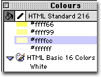 Painting user Hiroshi Tenasaku Fujita has created an excellent set of HTML Color Sets. There are two sets: one for the standard 16 colours and one for the 216 Netscape colours. Each colour in the set is properly namedÑthis is a great asset for anyone who needs to work with colours in HTML! The sets are available for download here, 4 K.